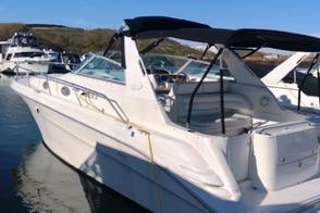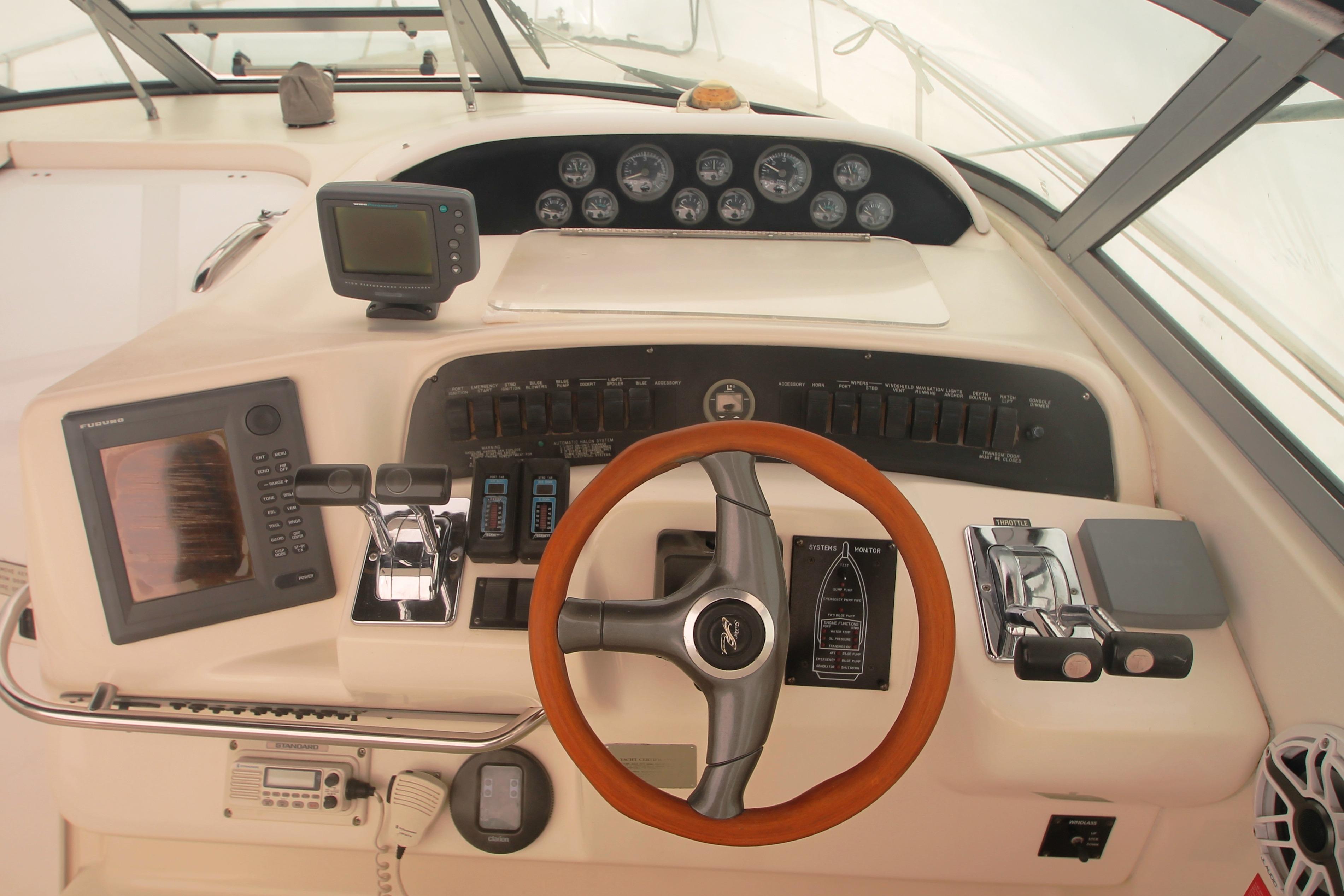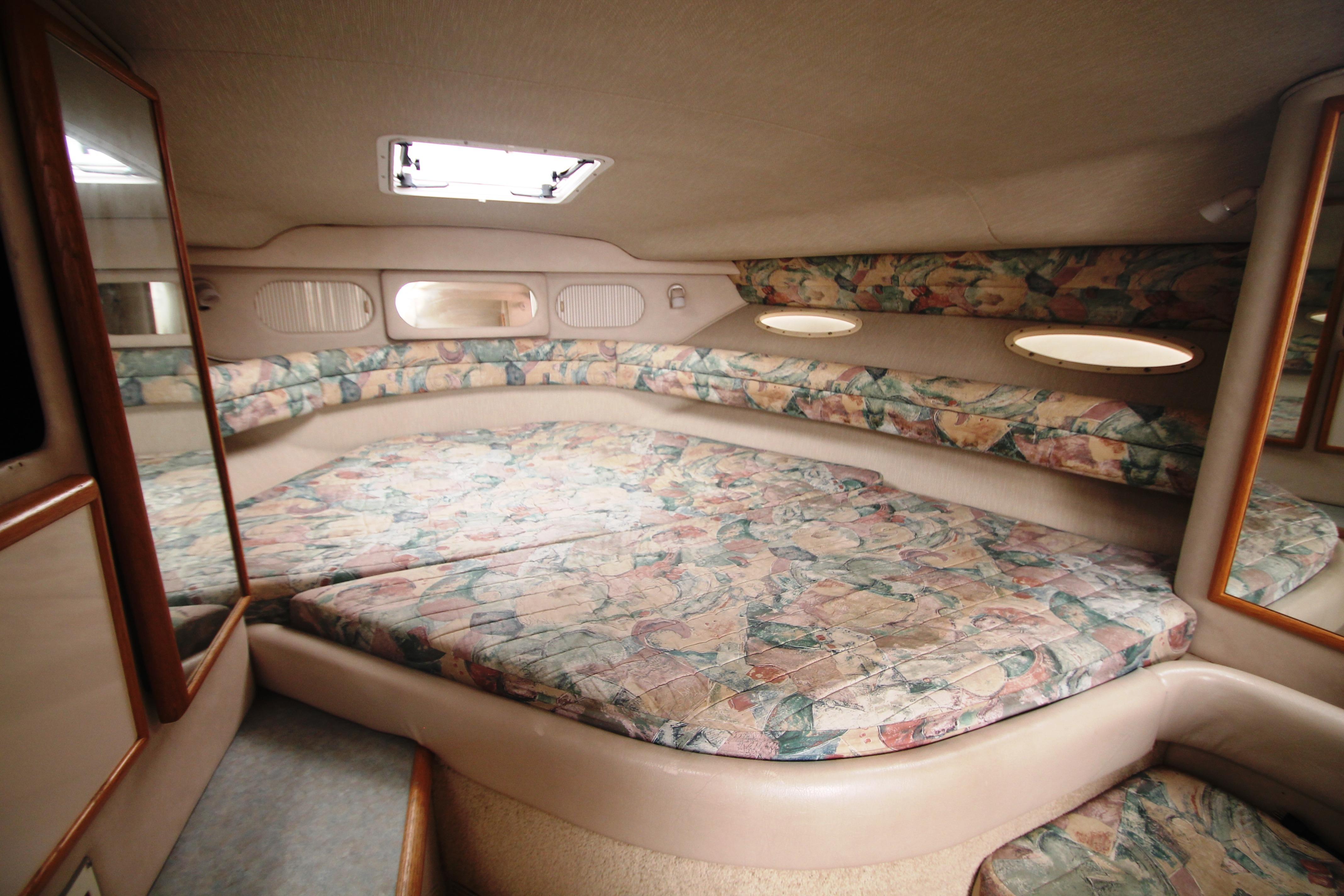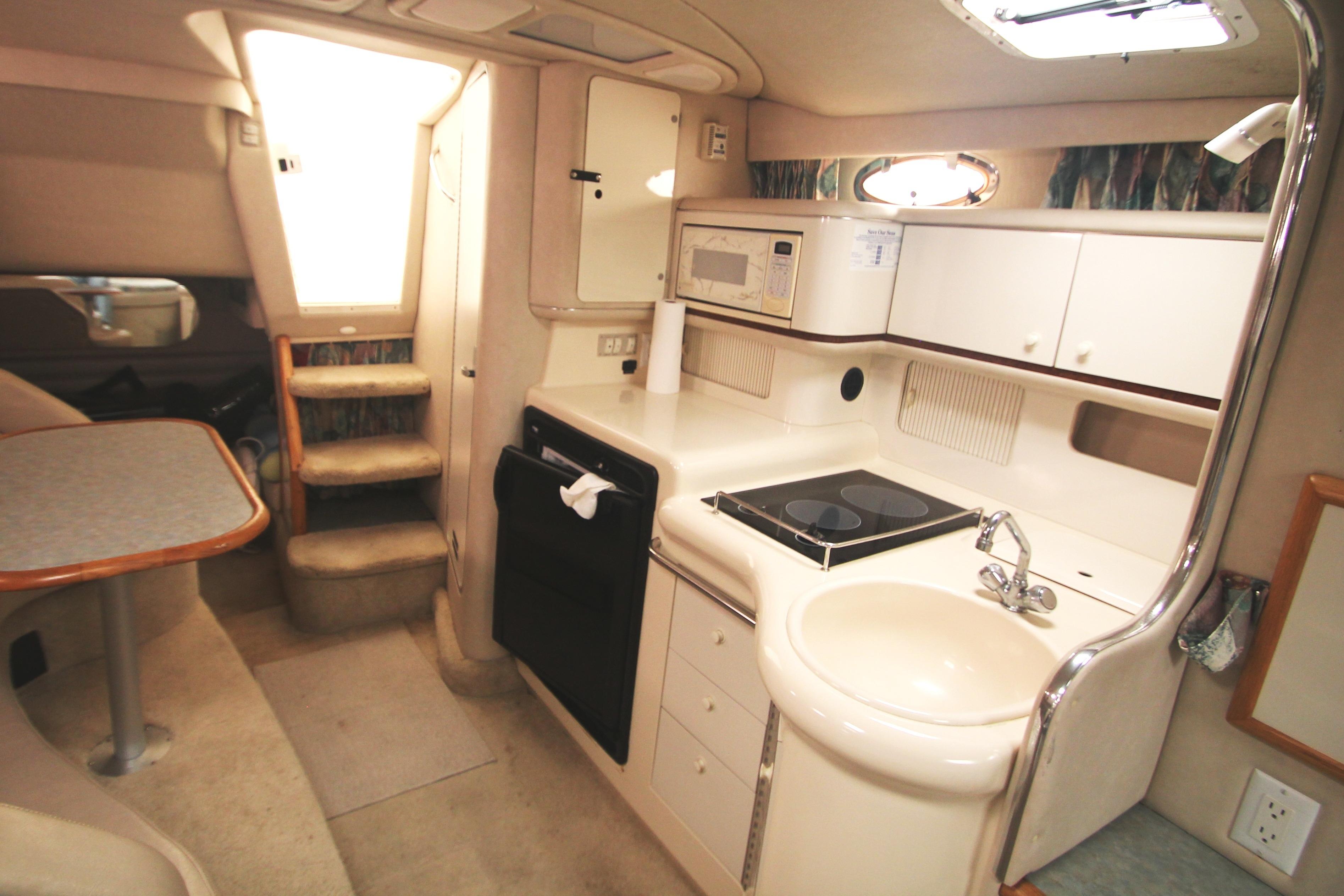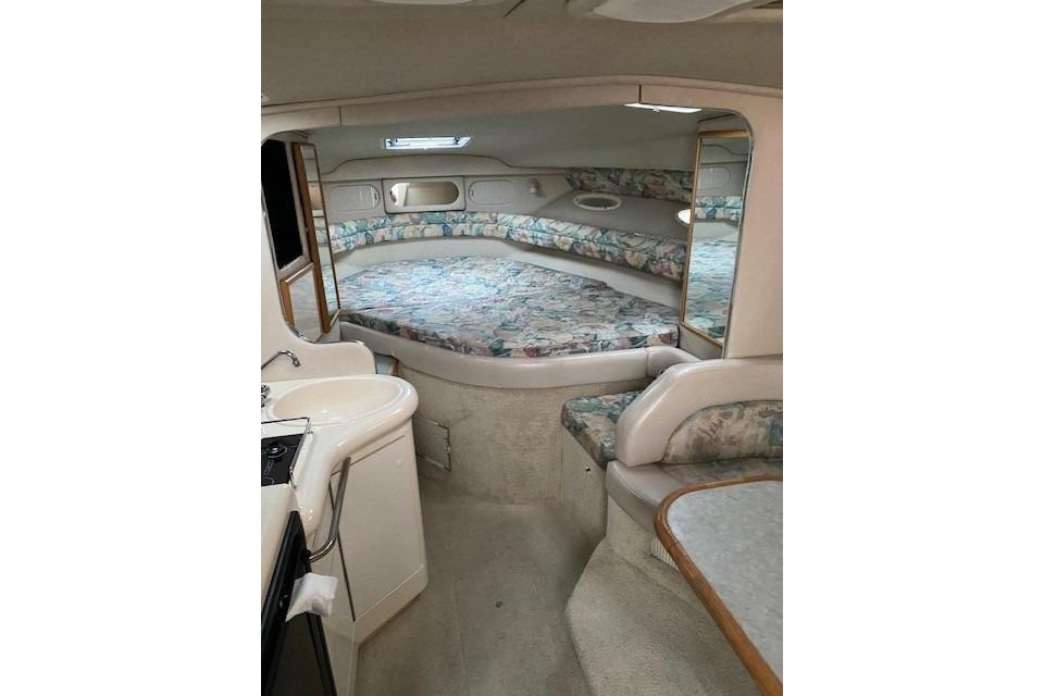 With its distinctive styling, the Sea Ray 330 Sundancer stands apart from the crowd. This 33-footer sleeps six, has a large, versatile cockpit and all the performance anyone ever needs in a family cruiser. With twin inboard MerCruiser V-drives the 330 Sundancer can be equipped for any adventure. The double helm seat gives captain and navigator a clear view of the water through the tempered glass windshield, which is center-vented to catch sea breezes and provide access to the foredeck. All instrumentation is within easy reach, including the standard VHF radio and Lowrance depth finder. A portside wet bar stands ready to accommodate any cockpit refreshment needs. The convenient fold-down step assists passengers in boarding. Lower the cockpit table, add the filler cushion, and create a sunpad for two. The aft seat is hinged so that the electrically actuated cockpit sole rises for instant access to the engines. Standard canvas package includes Sunbrella bimini top - sun shade with interlocking top extrusion, boot and vertical top storage, front bimini curtains, side curtains, and an aft cover to protect the cockpit. Belowdecks to starboard, a plush sofa provides plenty of room to relax as well as a comfortable dining area. Lower the table, add the plump filler cushion and the sofa turns into a double berth. The mid-stateroom functions as a conversation area during waking hours, then converts to a double berth during sleeping hours. A screened sliding window admits plenty of fresh air and light. The forward stateroom features a double berth, two large mirrored hanging lockers, a TV-VCR combination, and a privacy curtain that encloses the entire area. The head is located just inside the cabin door, providing easy access for passengers in the cockpit, as well as the cabin. The compartment includes a VacuFlush toilet, vanity with sink, and shower with curtain. In the galley, appointments include a large sink, refrigerator, flush-mounted two-burner electric stove, and microwave.