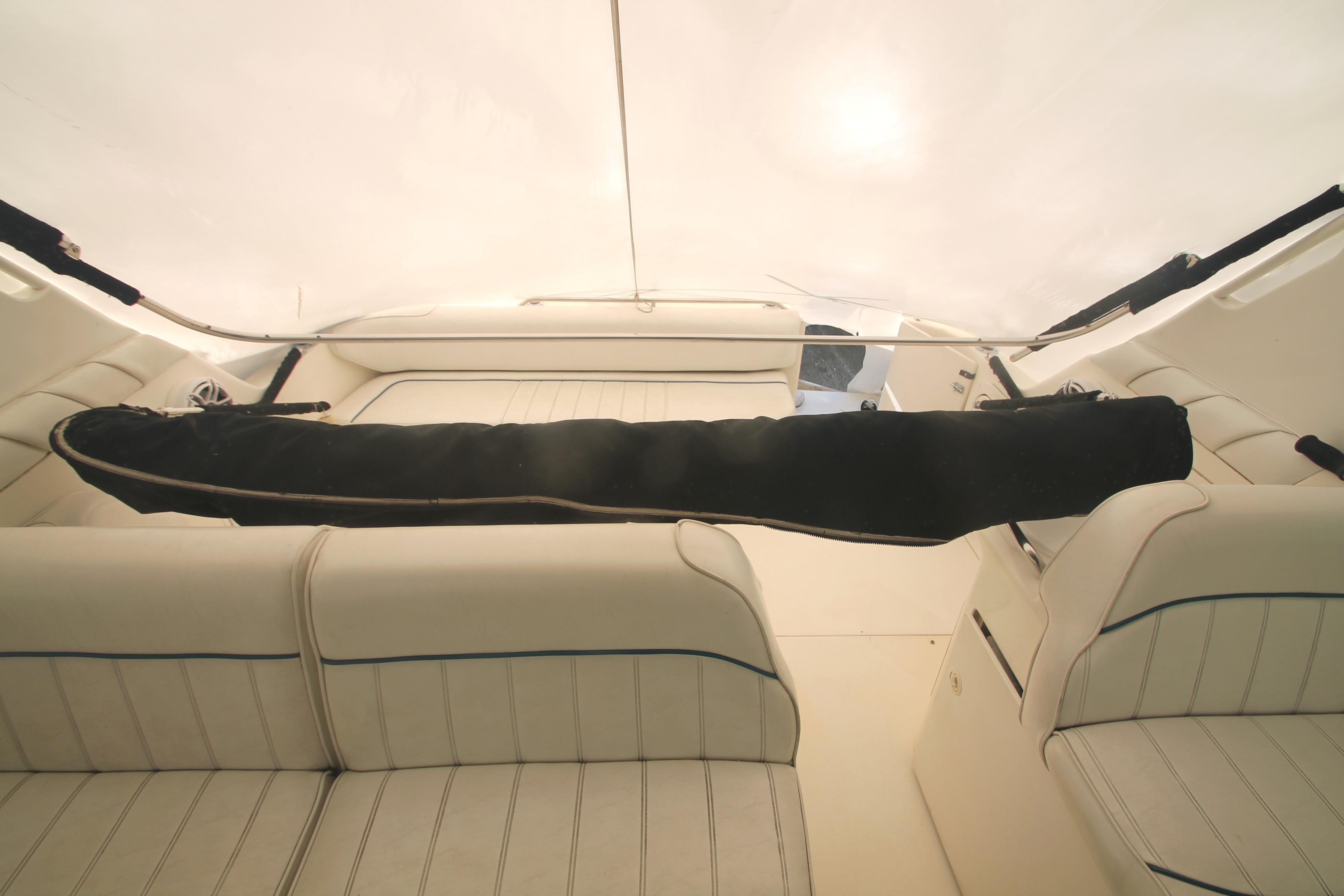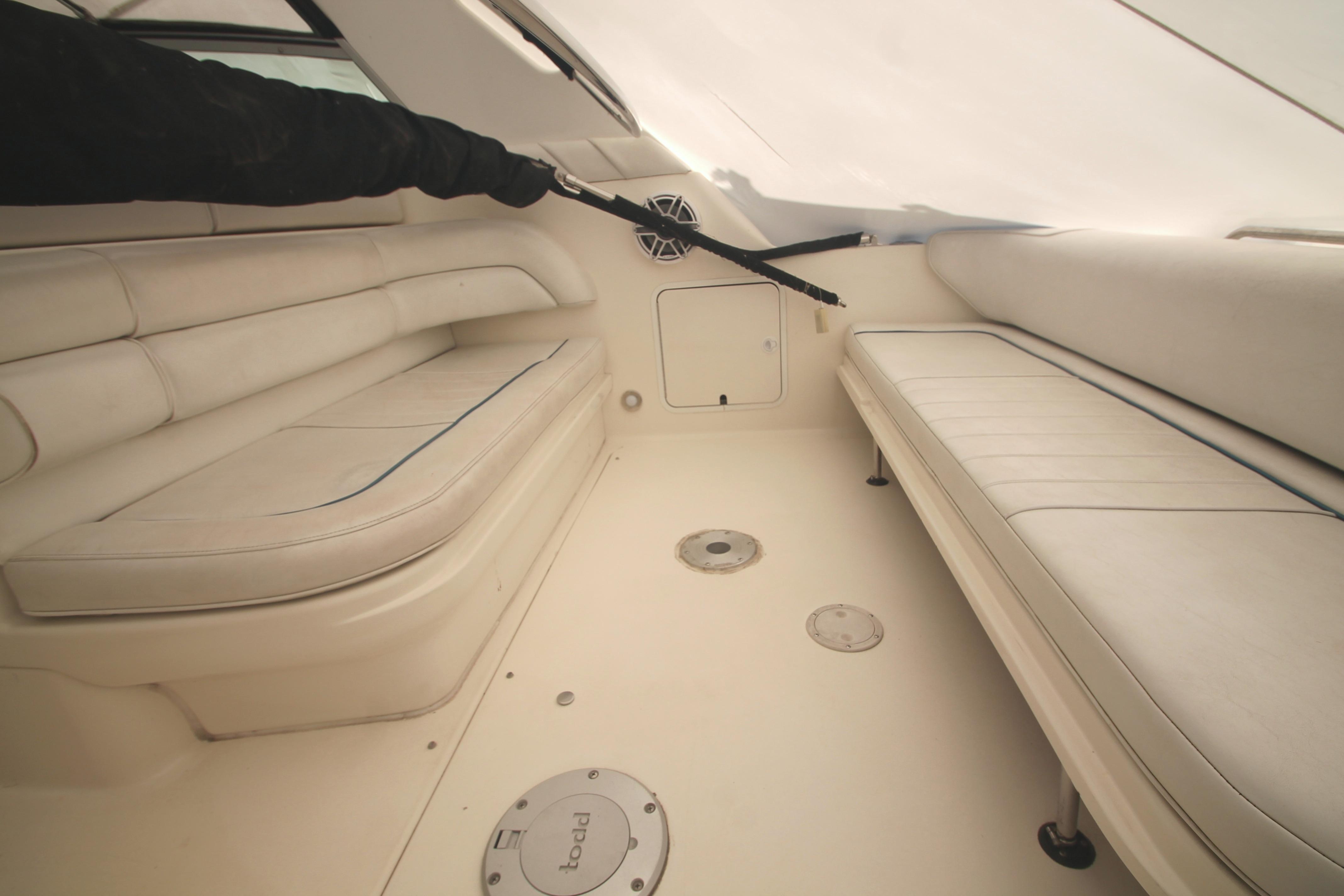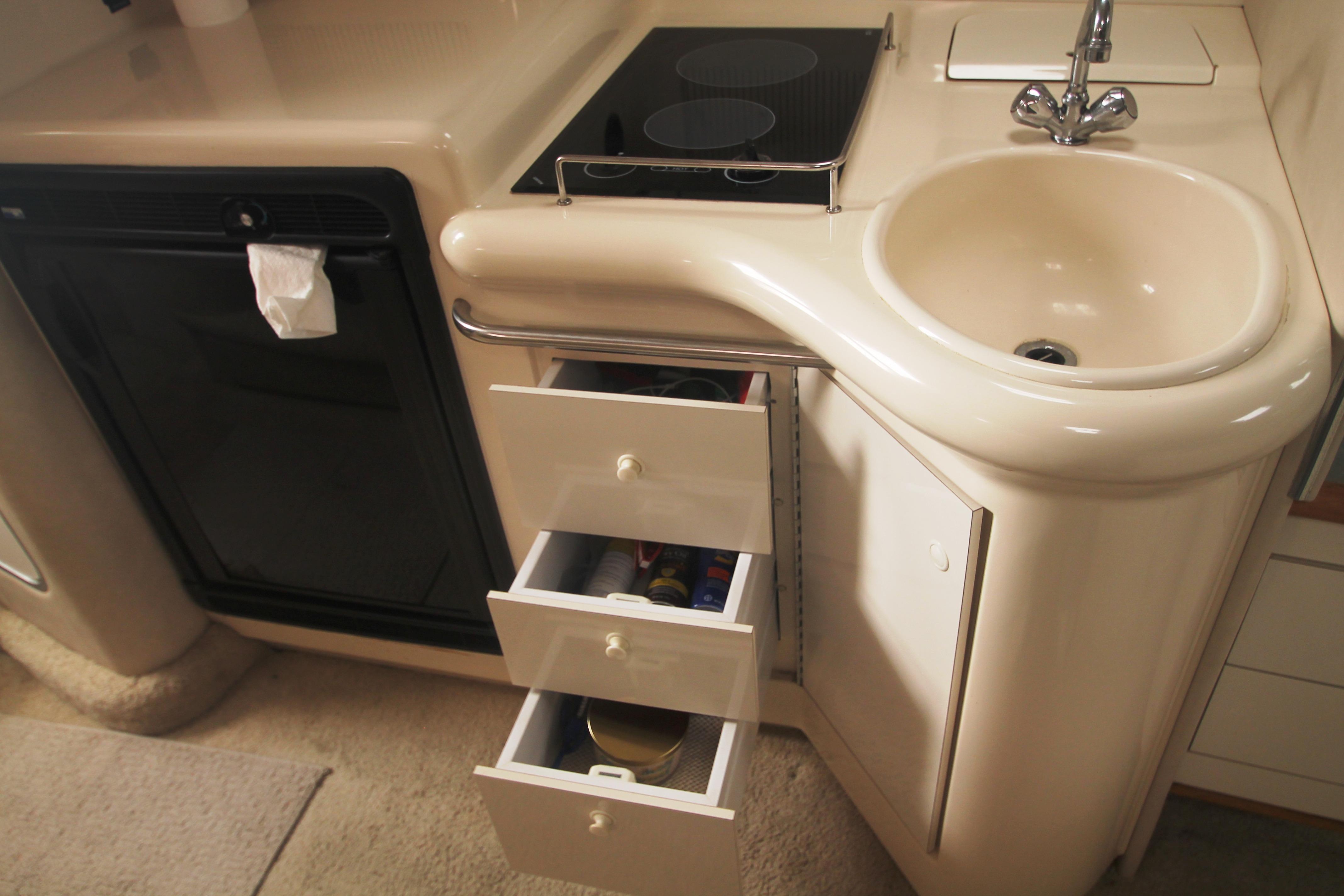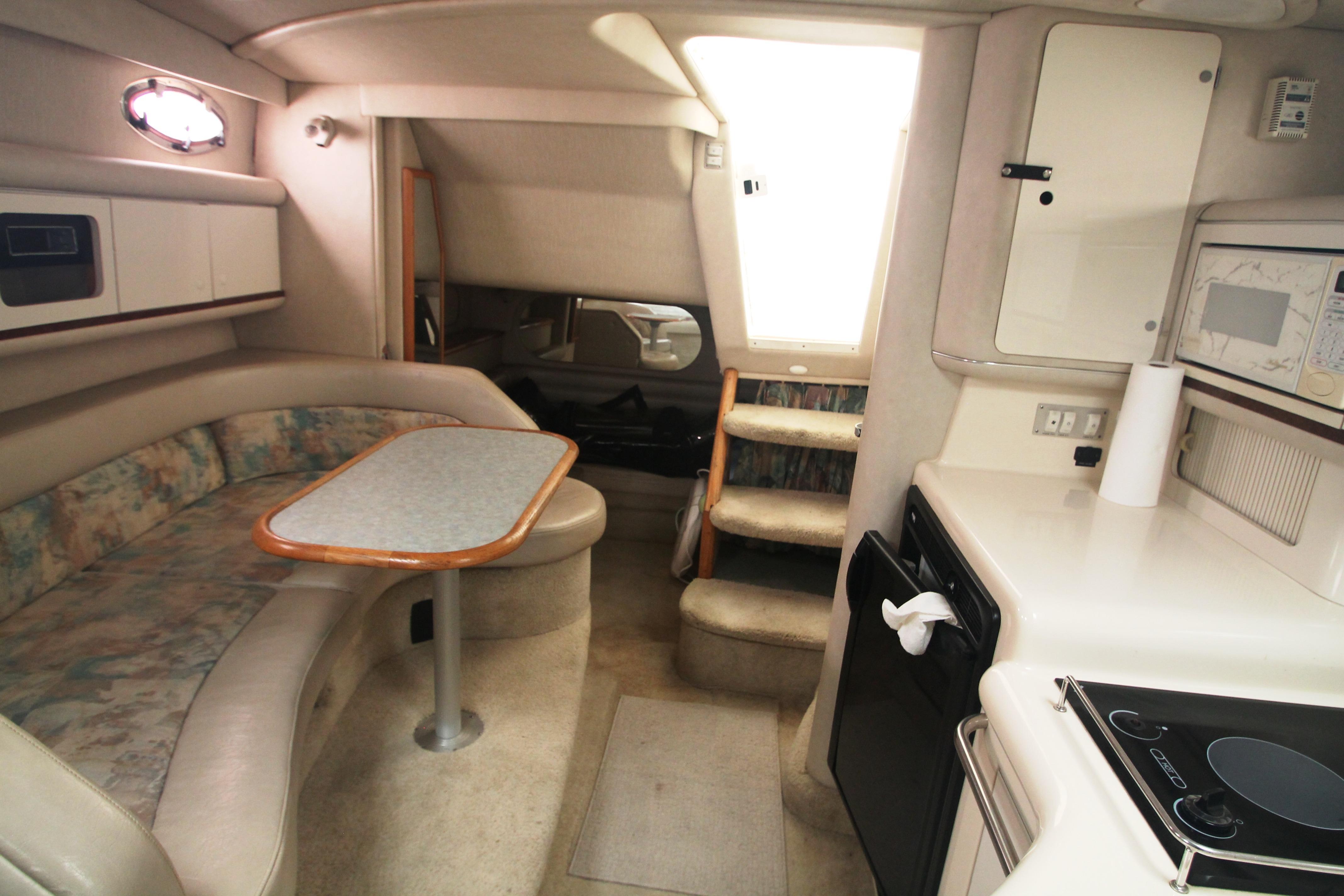 With its distinctive styling, the Sea Ray 330 Sundancer stands apart from the crowd. This 33-footer sleeps six, has a large, versatile cockpit and all the performance anyone ever needs in a family cruiser. With twin inboard MerCruiser V-drives the 330 Sundancer can be equipped for any adventure. The double helm seat gives captain and navigator a clear view of the water through the tempered glass windshield, which is center-vented to catch sea breezes and provide access to the foredeck. All instrumentation is within easy reach, including the standard VHF radio and Lowrance depth finder. A portside wet bar stands ready to accommodate any cockpit refreshment needs. The convenient fold-down step assists passengers in boarding. Lower the cockpit table, add the filler cushion, and create a sunpad for two. The aft seat is hinged so that the electrically actuated cockpit sole rises for instant access to the engines. Standard canvas package includes Sunbrella bimini top - sun shade with interlocking top extrusion, boot and vertical top storage, front bimini curtains, side curtains, and an aft cover to protect the cockpit. Belowdecks to starboard, a plush sofa provides plenty of room to relax as well as a comfortable dining area. Lower the table, add the plump filler cushion and the sofa turns into a double berth. The mid-stateroom functions as a conversation area during waking hours, then converts to a double berth during sleeping hours. A screened sliding window admits plenty of fresh air and light. The forward stateroom features a double berth, two large mirrored hanging lockers, a TV-VCR combination, and a privacy curtain that encloses the entire area. The head is located just inside the cabin door, providing easy access for passengers in the cockpit, as well as the cabin. The compartment includes a VacuFlush toilet, vanity with sink, and shower with curtain. In the galley, appointments include a large sink, refrigerator, flush-mounted two-burner electric stove, and microwave.