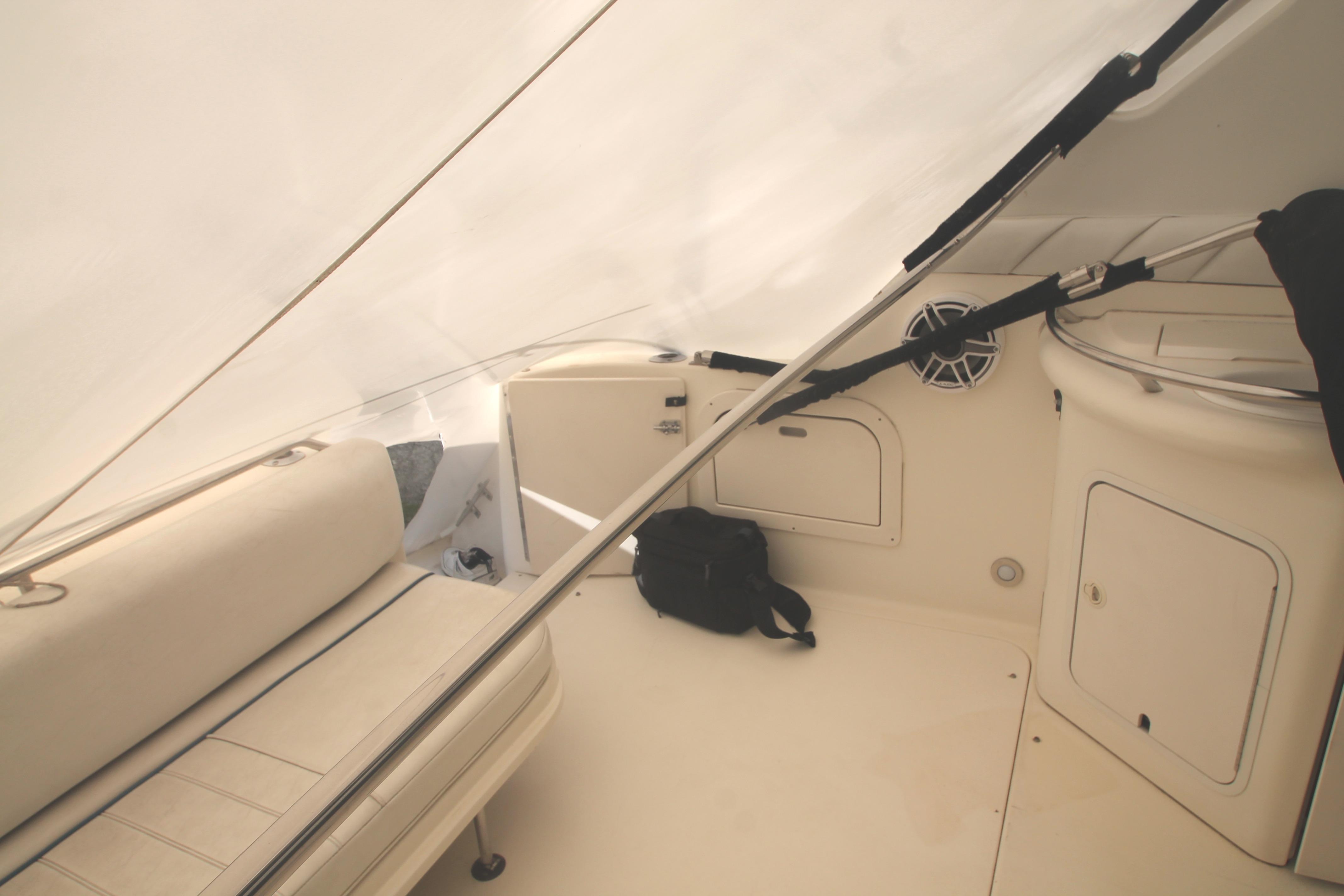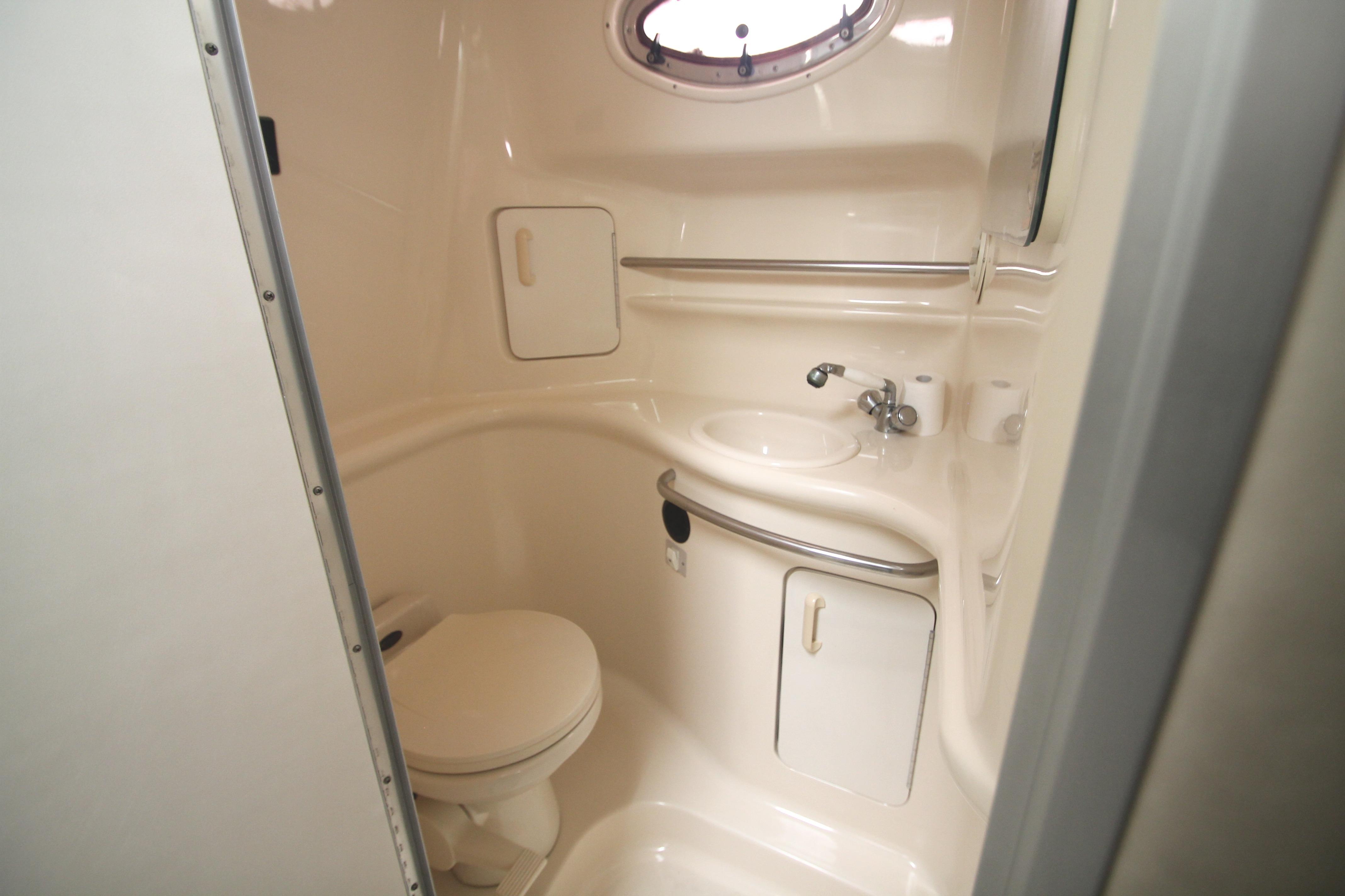 The cabin is entered by descending the stairs. A large open area greats you. Immediately to port is the Head with a shower and VacuFlush toilet. Further forward is the Galley. Across from the Galley is the Dinette. Forward is the Master Berth with Hanging Lockers port and starboard. Aft is the Mid-Stateroom with privacy curtain and small dressing table with mirrored Locker.