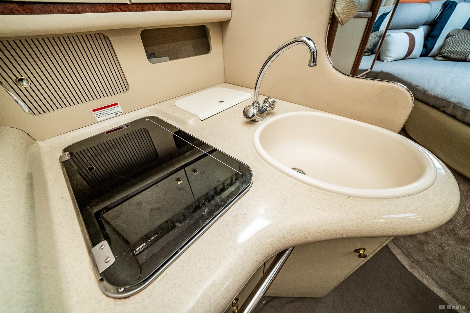 With its distinctive styling, the Sea Ray 330 Sundancer stands apart from the crowd. This 33-footer sleeps six, has a large, versatile cockpit and all the performance anyone ever needs in a family cruiser. With optional twin inboard MerCruiser V-drives in addition to standard twin 5.7L, 260 horsepower MerCruiser V-drives, the 330 Sundancer can be equipped for any adventure. The double helm seat gives captain and navigator a clear view of the water through the tempered glass windshield, which is center-vented to catch sea breezes and provide access to the foredeck. All instrumentation is within easy reach, including the standard VHF radio and Lowrance depth finder. A portside wet bar stands ready to accommodate any cockpit refreshment needs. The convenient fold-down step assists passengers in boarding. Lower the cockpit table, add the filler cushion, and create a sunpad for two. The aft seat is hinged so that the electrically actuated cockpit sole rises for instant access to the engines. Standard canvas package includes Sunbrella bimini top - sun shade with interlocking top extrusion, boot and vertical top storage, front bimini curtains, side curtains, and an aft cover to protect the cockpit. Belowdecks to starboard, a plush sofa provides plenty of room to relax as well as a comfortable dining area. Lower the table, add the plump filler cushion and the sofa turns into a double berth. The mid-stateroom functions as a conversation area during waking hours, then converts to a double berth during sleeping hours. A screened sliding window admits plenty of fresh air and light. The forward stateroom features a double berth, two large mirrored hanging lockers, a TV-VCR combination, and a privacy curtain that encloses the entire area. The head is located just inside the cabin door, providing easy access for passengers in the cockpit, as well as the cabin. The compartment includes a VacuFlush toilet, vanity with sink, and shower with curtain. In the galley, appointments include a large sink, refrigerator, flush-mounted two-burner electric stove, and microwave.